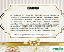Contaremos com a presença do Ilustre Presidente de Honra do IMAPH - Instituto Mineiro de Assistência e Promoção Humana, Dr” HC” Edson Silva Batista, e o Presidente do IPREMB - Instituto de Previdência Social do Município de Betim, Dr. Bruno Ferreira Cypriano.